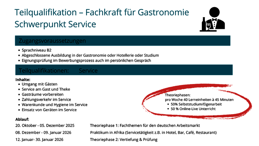 Das Programm Upskilling4Germany Gastronomie& Hotellerie ist ein modulares Qualifizierungsprogramm, das internationalen Fachkräften und Absolventen von Berufsausbildungen den Einstieg in die deutsche Gastronomie und Hotellerie erleichtern soll. Das Programm schließt die Lücke zwischen internationaler Erfahrung und deutschen Standards und vermittelt den Teilnehmern anerkannte Zertifizierungen und spezifische Kompetenzen, die von deutschen Arbeitgebern in der Gastronomie und im Gastgewerbe gefordert werden.